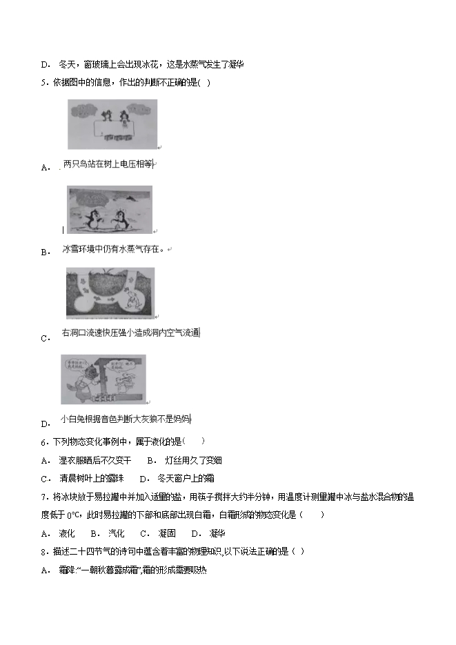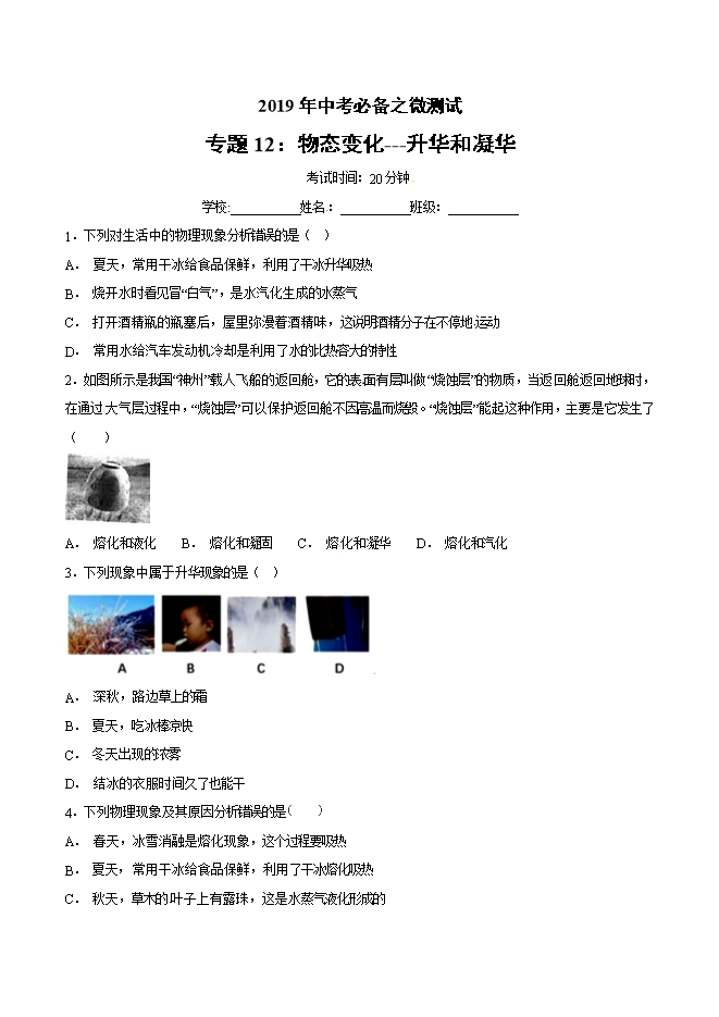 2019年中考物理必备之微测试:专题12 物态变化--升华和凝华(word原卷版和解析版)