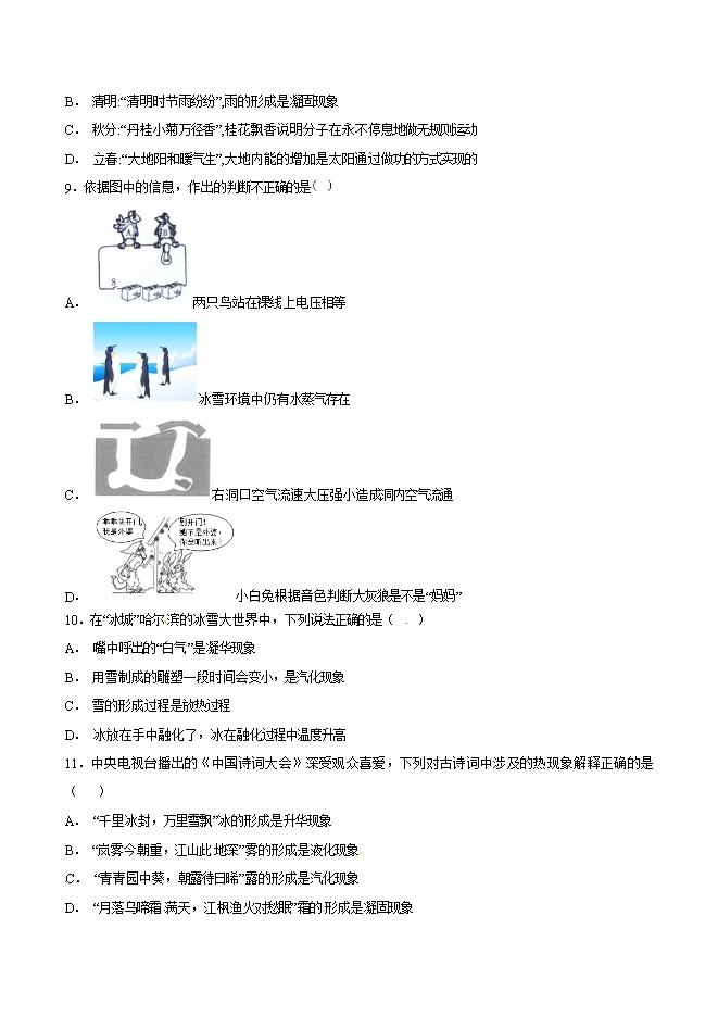 【内容简介】物质直接从固态变为液态的过程叫升华,升华吸热;(2)物质从气态变成液态称为液化,液化放热,“白气”通常是指大量的小水珠;物质由固态变为气态叫升华,升华吸热;(3)组成物质的分子在不停地做无规则运动;(4)水的比热容较大,与其它物质相比,在质量和升高的温度相同时,水吸收的热量最多。