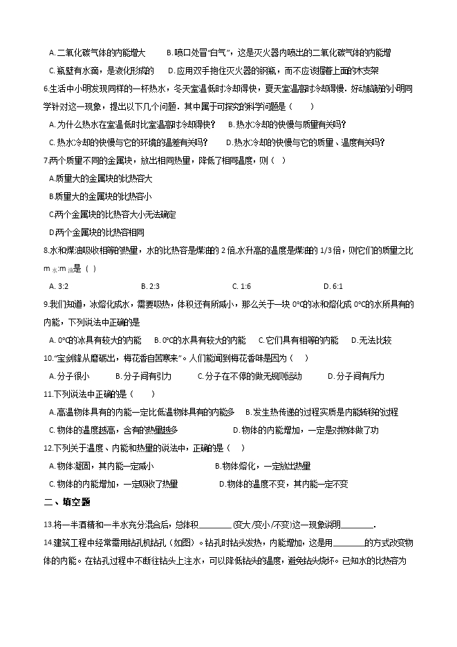 教科版九年级上册物理《第一章 分子动理论与内能》单元测试题(无答案)