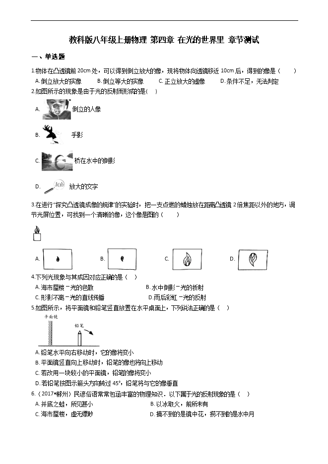 教科版八年级上册物理《第四章 在光的世界里》章节测试题及答案