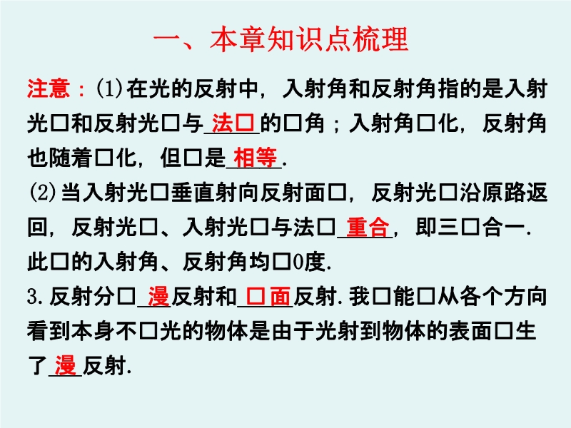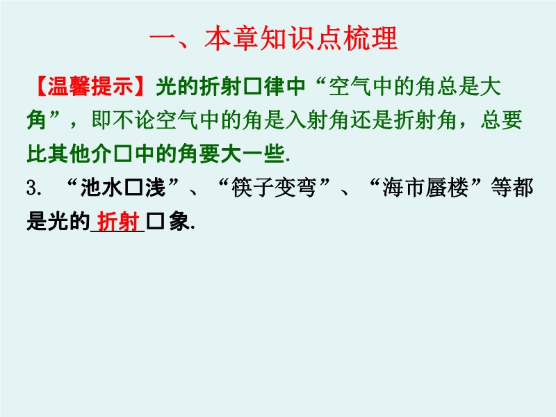 【内容简介】人教版《第四章 光现象》PPT单元复习课件,共有28张幻灯片,课件引导学生复习本章的知识,通过习题精炼提高学生的能力.