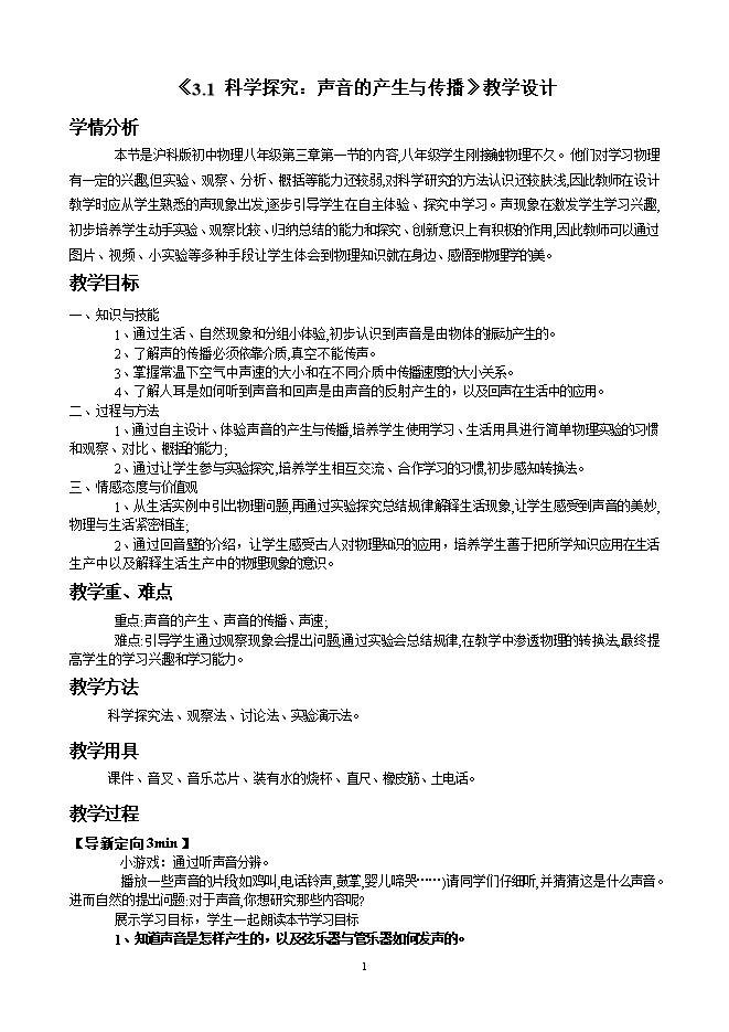 - 6872021秋沪科版物理八年级上册第3章《3.1 科学探究:声音的产生与传播》教案
