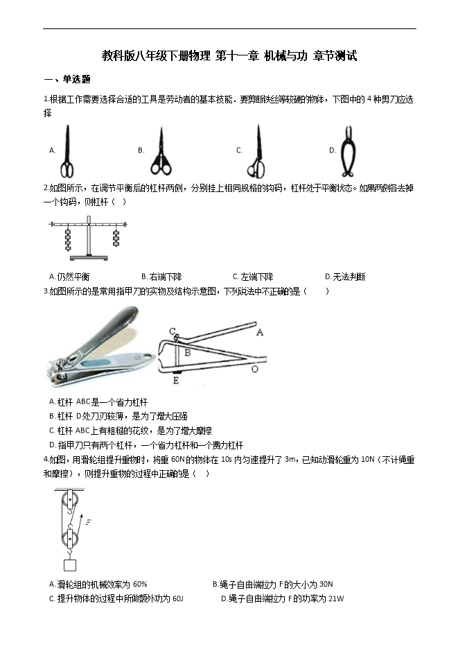 教科版八年级下册物理《第十一章 机械与功》章节测试题及答案