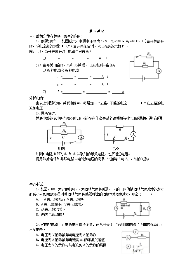 - 2782021秋人教版九年级物理全一册导学案:17.4 欧姆定律在串、并联电路中的应用(含答案)