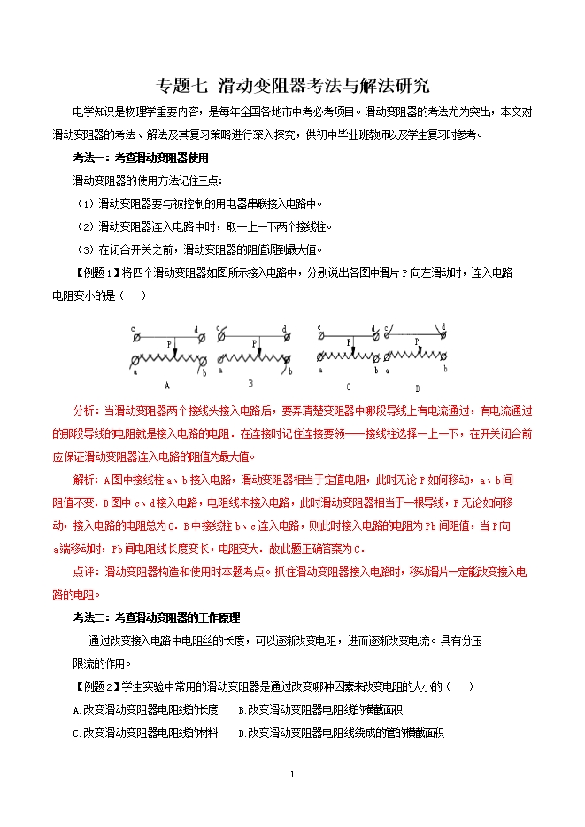 初中物理亮点问题考法与解法的十二个专题:专题七 滑动变阻器考法与解法研究