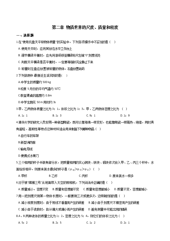 2018-2019学年北师大版物理八年级上册《第二章 物质世界的尺度、质量和密度》单元练习题及解析