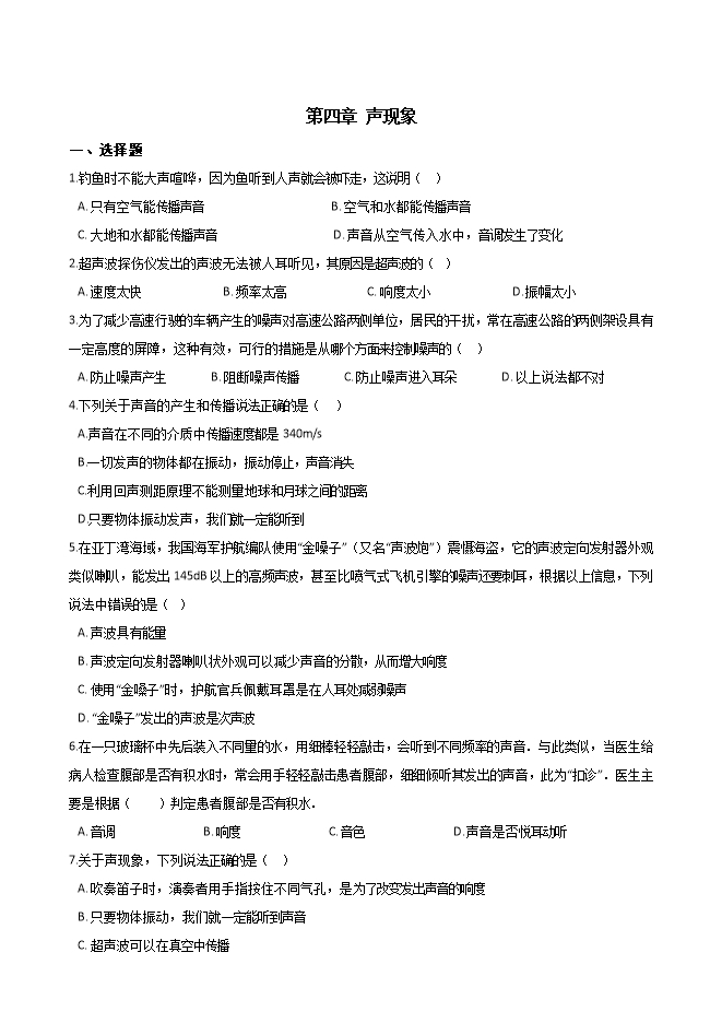 2018-2019学年北师大版物理八年级上册《第四章 声现象》单元练习题及解析
