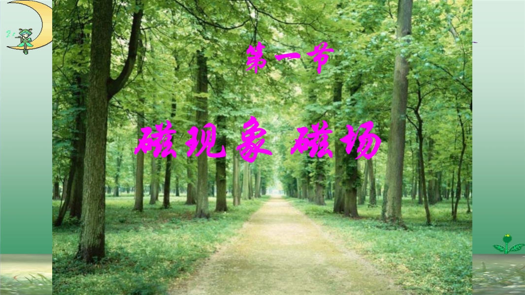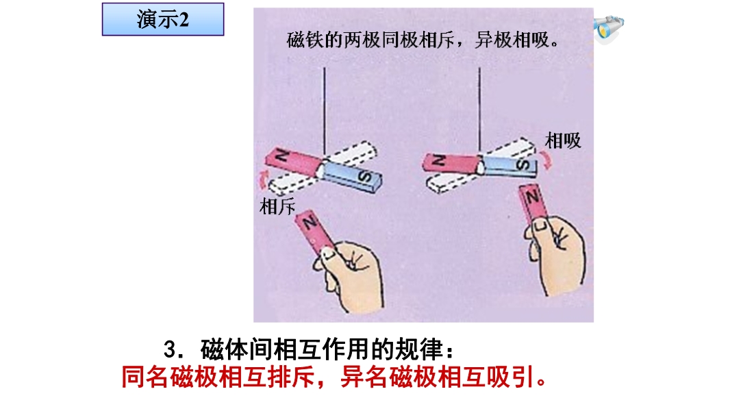 【内容简介】九年级人教版 《20.1磁现象 磁场》ppt课件,共51张幻灯片,课件引导学生认识了磁体和磁体的性质,介绍了磁化和去磁的方法,同时视频演示了磁体断后有几个磁极。展示了小磁针在磁铁周围的排列情况及铁屑在磁体周围的排列规律,让学生认识了磁体周围的磁场分布,讨论了磁场的性质,通过视频展示了地磁场和指南针的发明等。