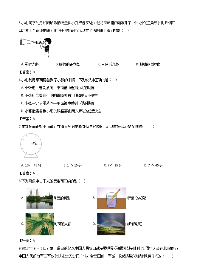 北师大版八年级上册物理《第五章 光现象》单元测试题及答案