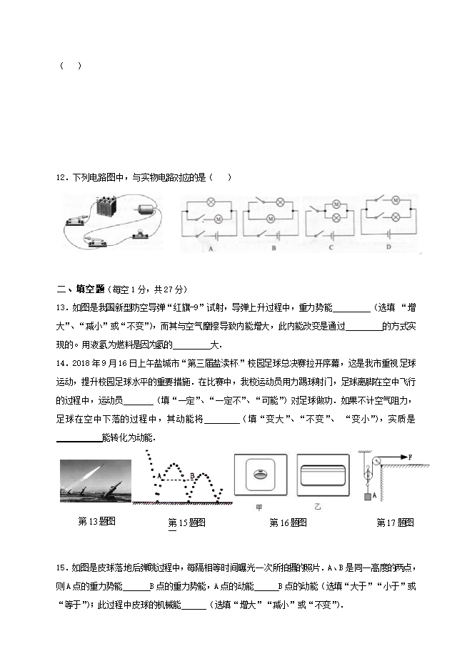 江苏省东台市第四联盟2019届九年级上学期期中考试物理试题及答案