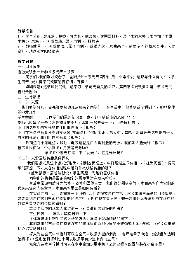 【内容简介】部级获奖课:人教版《4.1光的直线传播》,共有32张幻灯片,课件引导学生探究了光的传播,探究了光在空气、水中中的传播情况,总结了光的传播特点,解释了影子的形成、日食、月食全、小孔成像生活中常见的现象等,让学生进一步认识了光的直线传播。