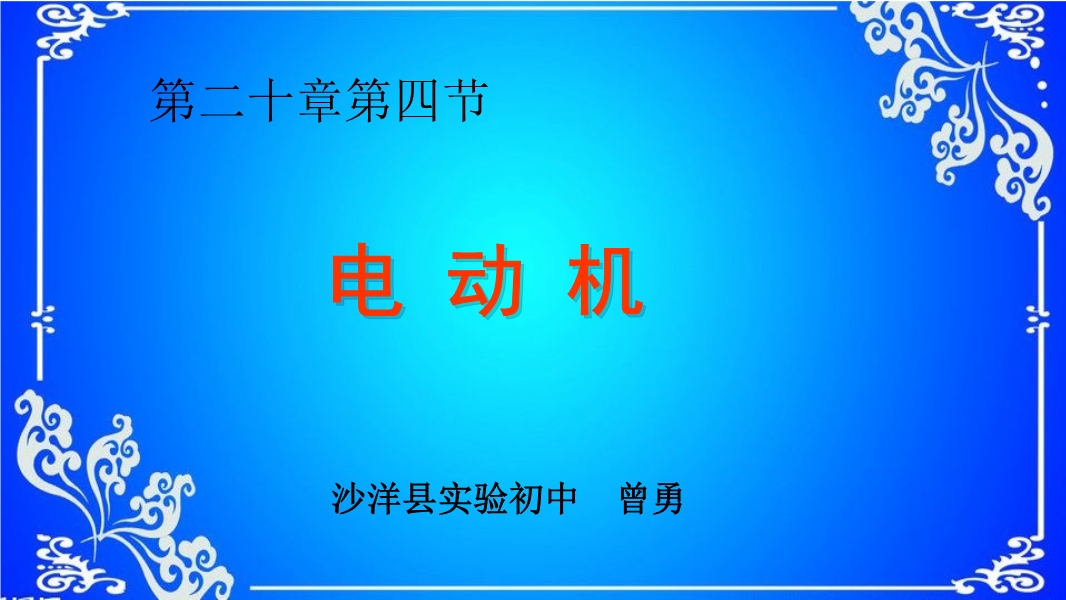 【内容简介】人教版:《20.4电动机》PPT课件,共有16张幻灯片,课件演示了磁场对通电导体有力的作用,并探究了力的方向与磁场方向和电流方向之间的关系,分析如何使线圈持续地转动,在此基础上,引导学生认识了电动机的工作原理及换和器的作用等。