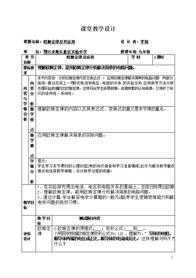 人教版:《17.2欧姆定律》PPT课件(东胜实验中学)