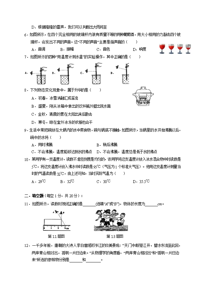 - 1162湖南省张家界市桑植县2018-2019学年八年级上学期期中考试物理试题及答案