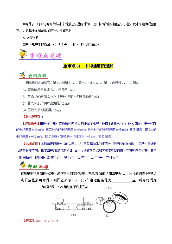 【内容简介】本节的内容为探究物体运动速度的变化,学生第一次接触物理实验探究,并通过实验,进一步加深对速度概念的理解及应用。通过探究过程,学会通过实验收集信息、客观评价结果是本节考查的主要方向,通常以填空题、实验探究题的形式考查,考查知识点有长度、时间的测量及读数,速度的计算,误差的分析等,难度一般不大。