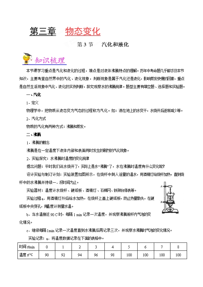 【内容简介】本节课学习重点是汽化和液化的过程,难点是对液体沸腾特点的理解。历年中考命题几乎都涉及本节知识,主要考查自然界中的汽化、液化现象,判断现象是属于汽化还是液化,影响蒸发快慢的因素,重点是自然生活现象中汽化、液化的实例判断,探究观察水的沸腾规律。题型主要有填空题、选择题和实验题。
