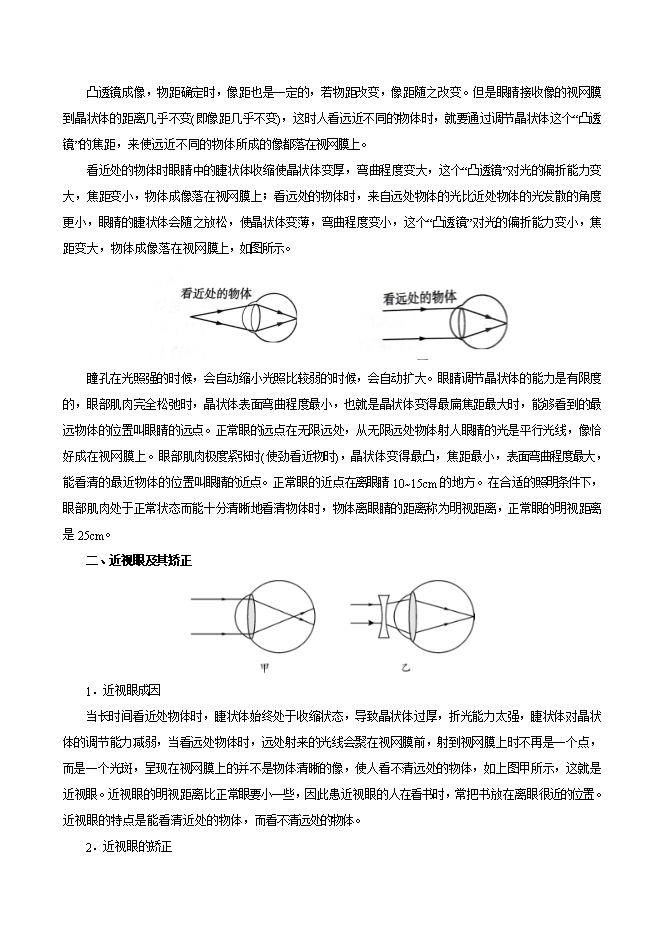 【内容简介】本节知识学习的重难点是眼睛的成像原理和视力矫正。中考命题多以近视眼、远视眼的识别及其矫正,解决生活中的实际问题为主。题型以选择题、填空题为主,难度适中。