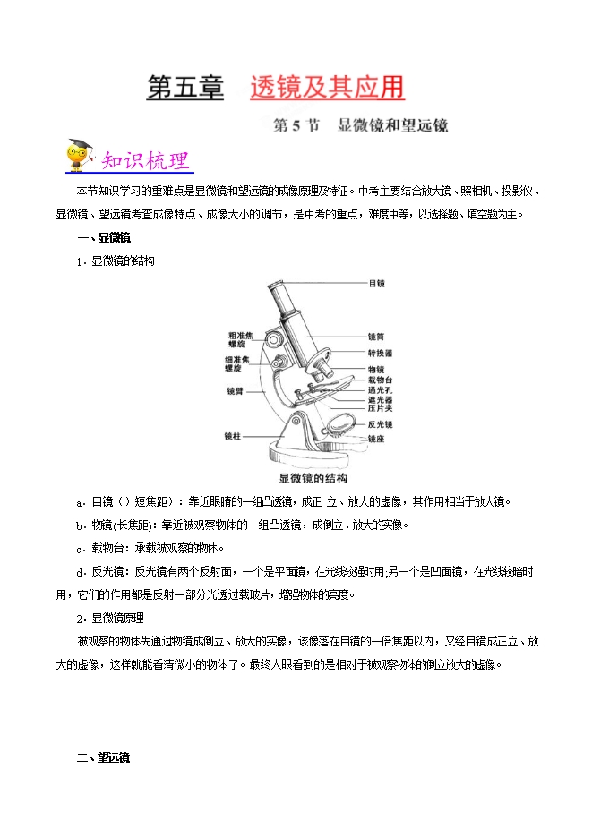 【内容简介】本节知识学习的重难点是显微镜和望远镜的成像原理及特征。中考主要结合放大镜、照相机、投影仪、显微镜、望远镜考查成像特点、成像大小的调节,是中考的重点,难度中等,以选择题、填空题为主。