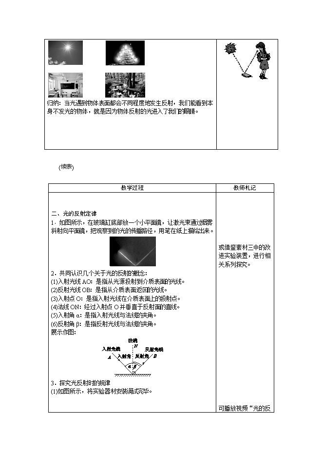 【内容简介】探究“光反射时的规律”时,要引导学生做好探究计划,使学生养成良好的学习习惯,明确每个探究步骤的主要活动内容,最后让学生归纳出探究的结果,需要注意的是,光的反射定律要让学生自己通过探究得出,重点强调的是反射角等于入射角。本探究的结果比较容易获得,探究过程比较好把握,教师应该关注学生在整个过程中的参与情况和科学态度方面的表现,对探究活动中认真积极的学生给予鼓励。反射规律探究结束后,可让学生做一些关于反射光路方面的练习,为平面镜成像的学习做一些准备。