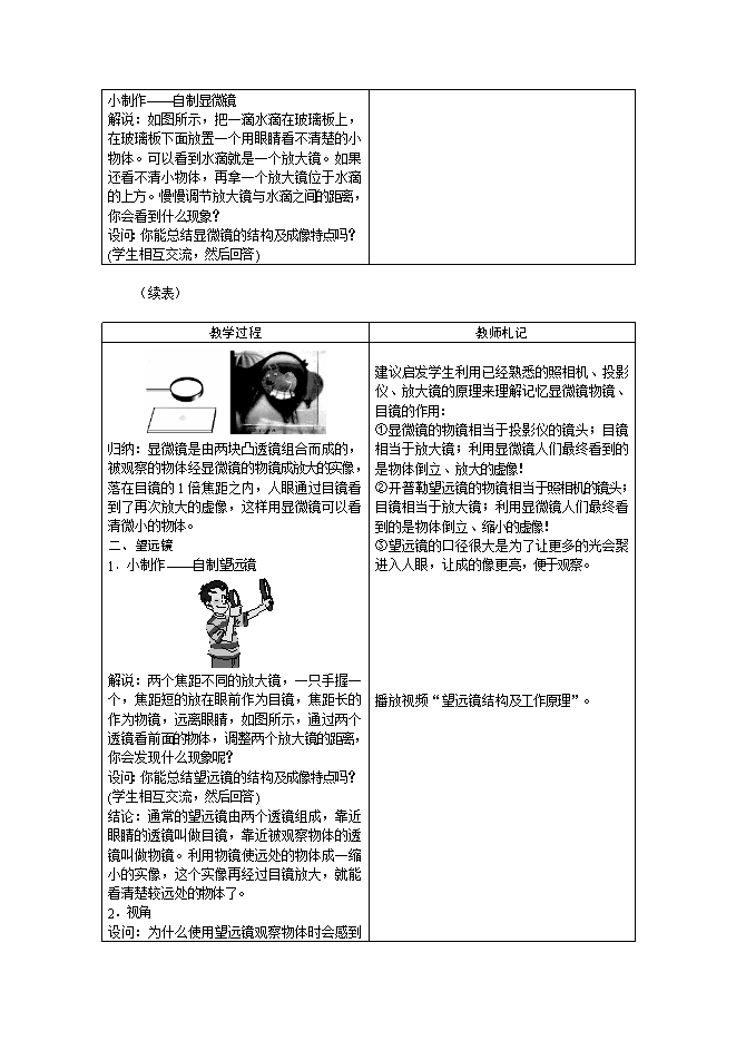 【内容简介】 建议在讲显微镜之前先复习一下放大镜的使用,用放大镜可以看清书本上的小字等较小的物体,要想看清细胞等非常小的物体,用一个放大镜就无能为力了,这就引入了显微镜。从凸透镜成像规律出发,介绍显微镜的原理,利用挂图介绍显微镜的结构,特别要强调两个透镜的组合作用,引导学生发散思维,培养学生综合运用所学知识的能力。 如果利用物镜使远处的物体成一缩小的实像,这个实像再经过目镜放大,就能看清楚较远处的物体,这就是望远镜。同样,利用挂图介绍望远镜的结构。利用望远镜能看清楚远处的物体,主要是由于望远镜物镜的直径比眼睛的瞳孔要大得多,它可以收集更多的光线,使远处的物体看起来更明亮。教材中主要介绍了开普勒式望远镜,同时可以向学生介绍其他类型的望远镜,扩大学生视野。