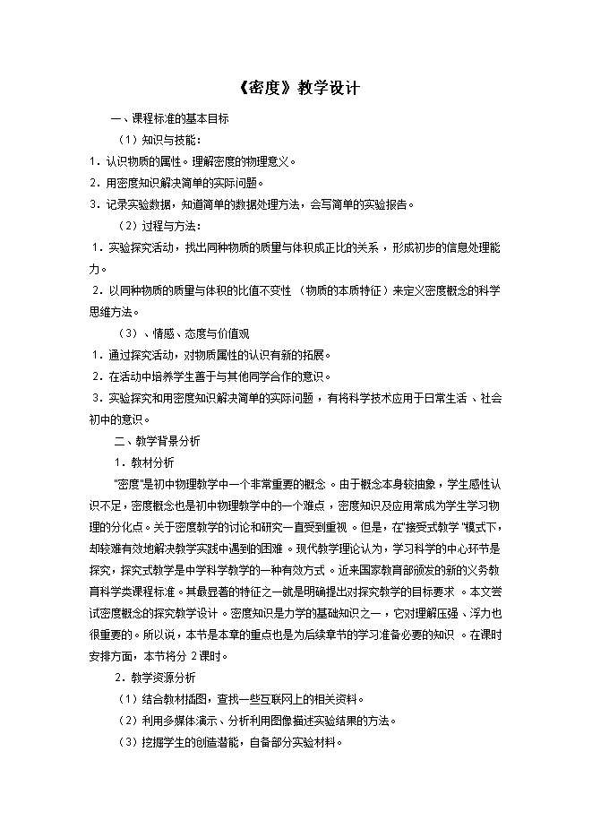 【内容简介】“密度”是初中物理教学中一个非常重要的概念。由于概念本身较抽象,学生感性认识不足,密度概念也是初中物理教学中的一个难点,密度知识及应用常成为学生学习物理的分化点。关于密度教学的讨论和研究一直受到重视。但是,在“接受式教学”模式下,却较难有效地解决教学实践中遇到的困难。现代教学理论认为,学习科学的中心环节是探究,探究式教学是中学科学教学的一种有效方式。近来国家教育部颁发的新的义务教育科学类课程标准。其最显著的特征之一就是明确提出对探究教学的目标要求。本文尝试密度概念的探究教学设计。密度知识是力学的基础知识之一,它对理解压强、浮力也很重要的。