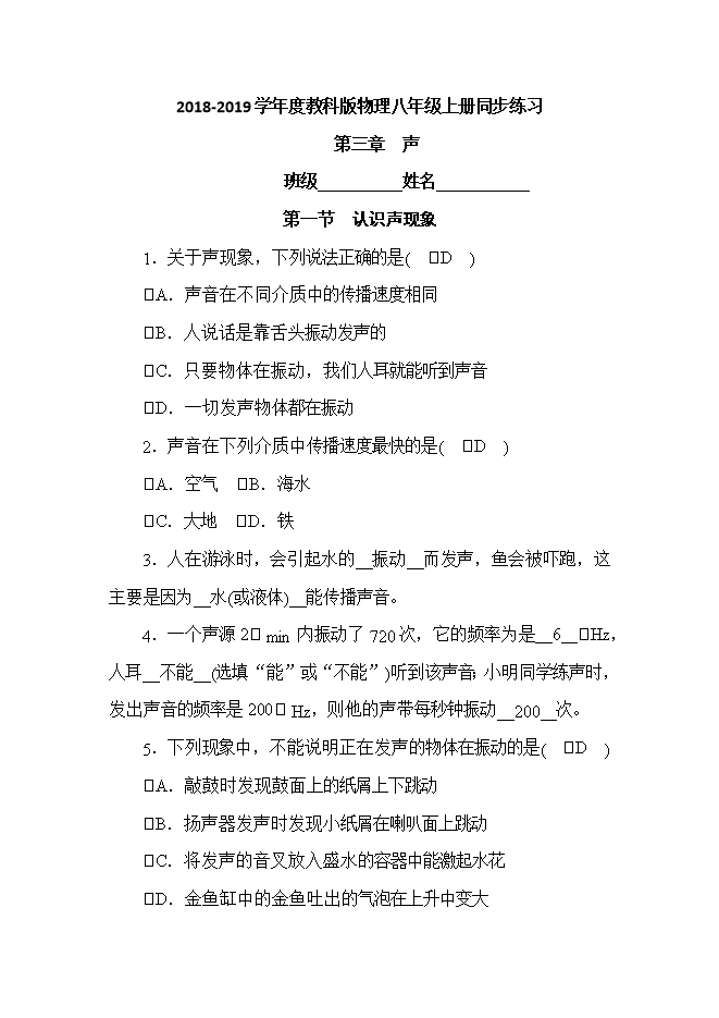 2018-2019学年度教科版物理八年级上册同步练习:3.1认识声现象