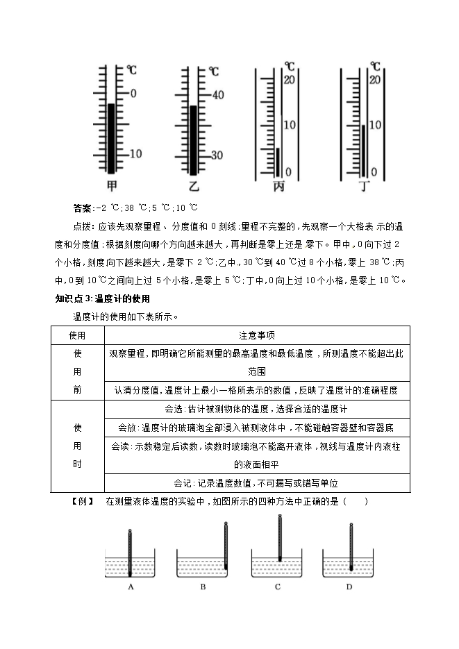 【内容简介】1.物体的冷热程度用温度来表示。 2.常用的温度计是利用液体热胀冷缩的性质制成的;常用温度计采用摄氏温度,符号是℃。 3.用温度计测量物体的温度,要注意温度计的使用规则,做到:会选、会放、会读、会记。   知识点1:温度计 1.温度 物体的冷热程度叫温度。对于物体温度的高低可以凭感觉来判断,但往往不可靠,要准确地判断或测量物体的温度就要使用温度计。 2.温度计 ①原理:家庭和实验室里常用的温度计是根据液体热胀冷缩的规律制成的。常用的测温液体有水银、酒精、煤油等。 ②构造:常用温度计的基本构造是:玻璃外壳、毛细管、玻璃泡、刻度及温标。如图所示就是常见的温度计:甲是实验室用的温度计;乙是体温计;丙是寒暑表。     拓展延伸 为了使温度计的测量结果更为精确,通常温度计的下端的玻璃泡较大,而温度计内的毛细管则较细,这样可以使液体体积变化显示得更明显。 【例】 如图所示是小林利用小瓶、橡皮塞和玻璃管自制的液体温度计,该温度计是根据液体    的规律工作的,若发现玻璃管中的液面上升,说明周围环境温度    了。   答案:热胀冷缩;升高 点拨:液体温度计是利用液体热胀冷缩的性质制成的,当温度升高时,瓶内液体体积增加,使玻璃管中的液体增多,液面上升。 知识点2:摄氏温度 1.摄氏温度 摄氏温度,物理量的表示符号为t,它的单位叫摄氏度,符号为℃。摄氏温度是这样规定的:在1个标准大气压下,把冰水混合物的温度规定为0摄氏度,把沸水的温度规定为100摄氏度,在0摄氏度和100摄氏度之间分成100等份,每一等份就是1摄氏度。[来源:学科网ZXXK] 2.摄氏温度数值的读与写 摄氏温度以0摄氏度为起点,分为零上和零下两部分,其写法和读数有所不同,例如,人的正常体温是“37 ℃”,读做“37摄氏度”;我国黑龙江漠河镇的最低气温达到“-52.3 ℃”,读做“负52.3摄氏度”或“零下52.3摄氏度”。 易错警示 理解摄氏温度应注意以下几点:①温度表示物体的冷热程度,它只有“高低”之别,没有“有无”之分,0 ℃不是说物体没有温度。 ②摄氏温度用符号℃表示,读做“摄氏度”,它是一个整体,不能分开。 ③能否正确判断温度计的示数在0刻度线以上还是以下,是正确读数的关键。如果温度计示数向上越来越大,即为零上;如果向下越来越大,即为零下。 【例】 图中甲、乙、丙、丁各温度计的分度值是1 ℃,它们的读数分别是:    、    、    、    。    答案:-2 ℃;38 ℃;5 ℃;10 ℃ 点拨:应该先观察量程、分度值和0刻线;量程不完整的,先观察一个大格表示的温度和分度值;根据刻度向哪个方向越来越大,再判断是零上还是零下。甲中,0向下过2个小格,刻度向下越来越大,是零下2 ℃;乙中,30 ℃到40 ℃过8个小格,零上38 ℃;丙中,0到10 ℃之间向上过5个小格,是零上5 ℃;丁中,0向上过10个小格,是零上10 ℃。 知识点3:温度计的使用 温度计的使用如下表所示。 使用 注意事项 使 用 前 观察量程,即明确它所能测量的最高温度和最低温度,所测温度不能超出此范围 认清分度值,温度计上最小一格所表示的数值,反映了温度计的准确程度 使 用 时 会选:估计被测物体的温度,选择合适的温度计 会放:温度计的玻璃泡全部浸入被测液体中,不能碰触容器壁和容器底 会读:示数稳定后读数,读数时玻璃泡不能离开液体,视线与温度计内液柱的液面相平 会记:记录温度数值,不可漏写或错写单位 【例】 在测量液体温度的实验中,如图所示的四种方法中正确的是(  )