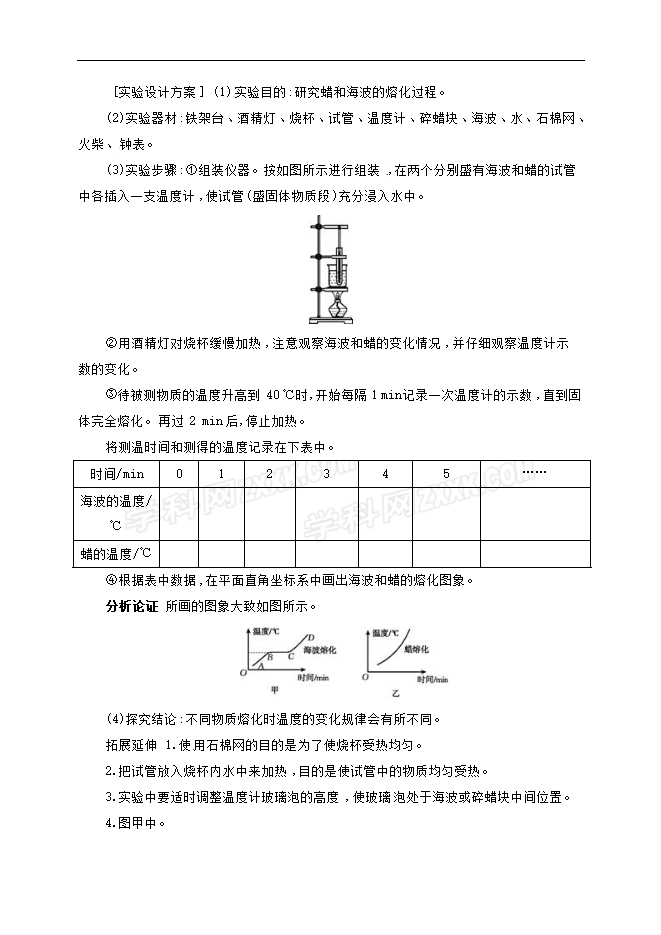 [实验设计方案] (1)实验目的:研究蜡和海波的熔化过程。