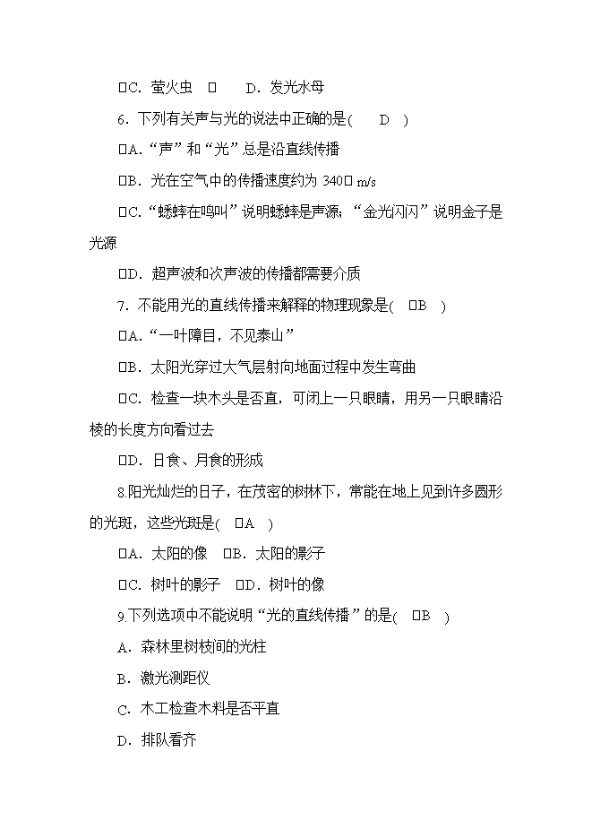 8.阳光灿烂的日子,在茂密的树林下,常能在地上见到许多圆形的光斑,这些光斑是( A )