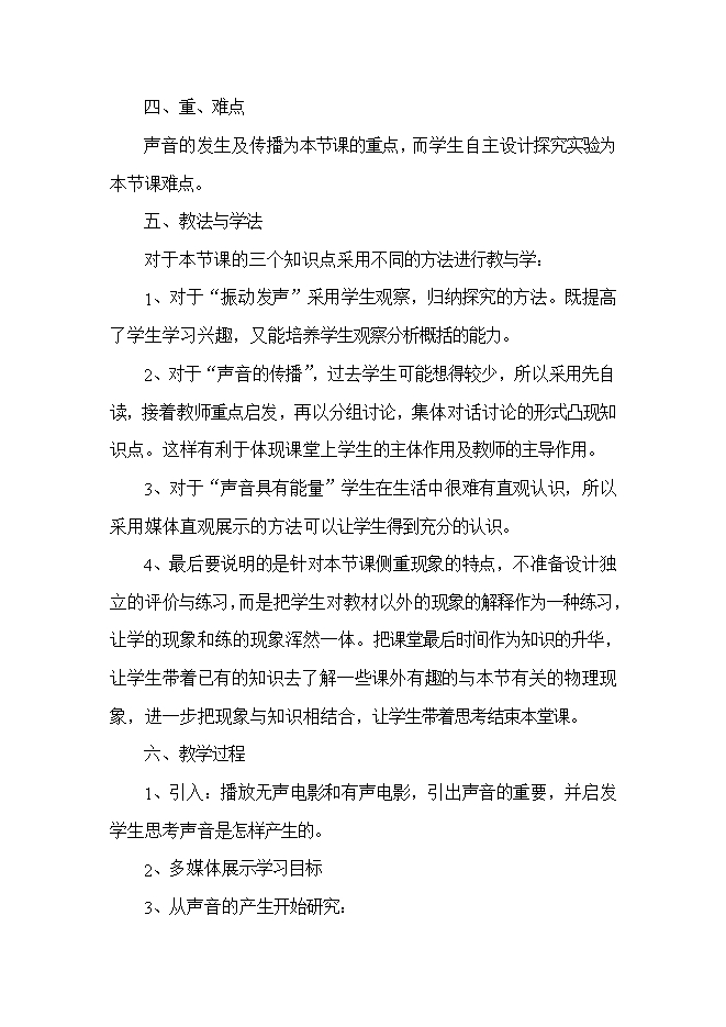 声音的发生及传播为本节课的重点,而学生自主设计探究实验为本节课难点。