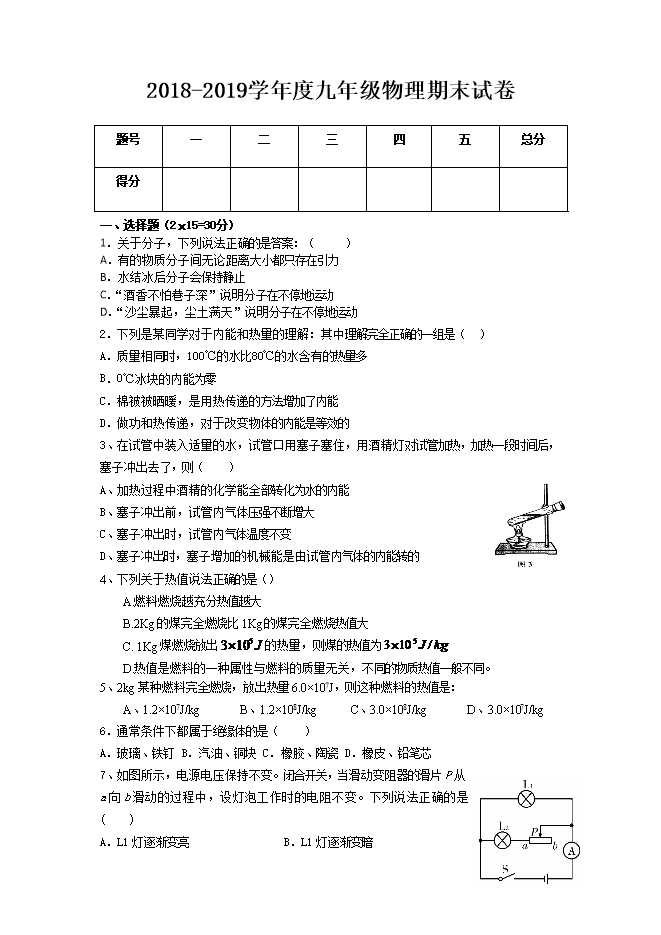 【内容简介】 一、选择题(215=30分) 1.关于分子,下列说法正确的是答案:() A.有的物质分子间无论距离大小都只存在引力 B.水结冰后分子会保持静止  C.“酒香不怕巷子深”说明分子在不停地运动 D.“沙尘暴起,尘土满天”说明分子在不停地运动 2.下列是某同学对于内能和热量的理解:其中理解完全正确的一组是(  )  A.质量相同时,100℃的水比80℃的水含有的热量多     B.0℃冰块的内能为零  C.棉被被晒暖,是用热传递的方法增加了内能  D.做功和热传递,对于改变物体的内能是等效的 3、在试管中装入适量的水,试管口用塞子塞住,用酒精灯对试管加热,加热一段时间后,塞子冲出去了,则(    ) A、加热过程中酒精的化学能全部转化为水的内能 B、塞子冲出前,试管内气体压强不断增大 C、塞子冲出时,试管内气体温度不变 D、塞子冲出时,塞子增加的机械能是由试管内气体的内能转的X| k 4、下列关于热值说法正确的是() A.燃料燃烧越充分热值越大 B.2Kg的煤完全燃烧比1Kg的煤完全燃烧热值大 C. 1Kg煤燃烧放出的热量,则煤的热值为 D.热值是燃料的一种属性与燃料的质量无关,不同的物质热值一般不同。 5、2kg某种燃料完全燃烧,放出热量6.0×107J,则这种燃料的热值是:     A、1.2×107J/kg       B、1.2×108J/kg      C、3.0×108J/kg       D、3.0×107J/kg       6.通常条件下都属于绝缘体的是(    )  A.玻璃、铁钉 B.汽油、铜块 C.橡胶、陶瓷 D.橡皮、铅笔芯 7、如图所示,电源电压保持不变。闭合开关,当滑动变阻器的滑片P从a向b滑动的过程中,设灯泡工作时的电阻不变。下列说法正确的是(    ) A.L1灯逐渐变亮                B.L1灯逐渐变暗      C.电流表的示数逐渐变大        D.滑动变阻器两端的电压逐渐变大 8、下列情况中不属于防止电热危害的是(  ) A.电视机的后盖有许多孔            B.电脑机箱内有小风扇 C.电动机外壳有许多散热片          D.家电长时间停用,隔一段时间应通电一次 9、白炽灯泡的灯丝断开后,可把断头搭接起来继续使用,这时灯丝的(  ) A.电阻变大,电流减小     B.电阻变小,电流增大 C.电阻和电流都增大       D.电阻和电流都减小 10、带负电的物体靠近一个轻小球,小球被吸引过来,则这个小球(  ) A.一定带正电                      B.一定带负电 C.可能带正电,也可能不带电        D.可能带负电,也可能不带 11、在如图所示的电路中,闭合开关,两表有示数,过一会后发现两只电表中有一只电表的示数明显变小,另一只电表的示数明显变大.下列判断中正确的是(  ) A.可能是灯L断路        B.一定是灯L短路 C.可能是滑动变阻器R断路 D.一定是滑动变阻器R的滑片向左滑动                      12、小明将额定电压是220V的甲、乙二灯串联接在220V的电源上,闭合开关后,甲灯发光,乙灯不发光,则(  ) A.乙灯的灯丝断了         B.乙灯的电阻太小   C.乙灯的电阻太大         D.乙灯两端电压太大 13、在学习了内能及能量的转化和守恒后,同学们在一起梳理知识时交流了以下想法,你认为其中不正确的是(  ) A.做功可以改变物体的内能 B.热传递改变物体内能是不同形式的能量的互相转化 C.在一定条件下各种形式的能量可以相互转化 D.能量在转移和转化的过程中总会有损耗,但能量的总量总保持不变 14、根据欧姆定律公式I=U/ R ,也可变形得到R=U /I .对此,下列说法中正确的是(  ) A.流过导体的电流越大,则电阻越小    B.某段导体两端电压为0时,其电阻为0  C.导体两端的电压跟通过导体电流的比值等于这段导体的电阻 D.导体电阻的大小跟导体两端的电压成正比,跟通过导体的电流成反比 15、如图所示的四幅图中能说明发电机工作原理的是()