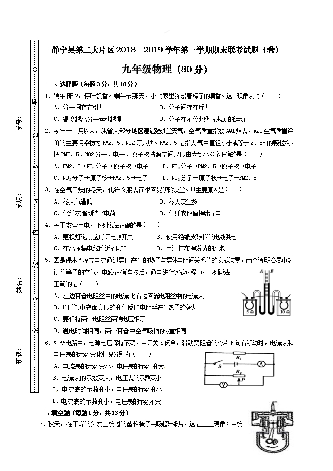 甘肃省静宁县第二大片区2019届九年级上学期期末联考物理试题及答案