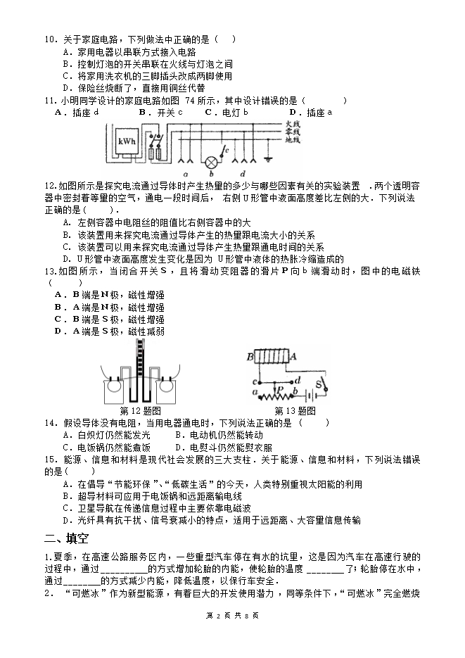 山东省德州十中2018-2019学年第一学期期末九年级物理检测题及答案