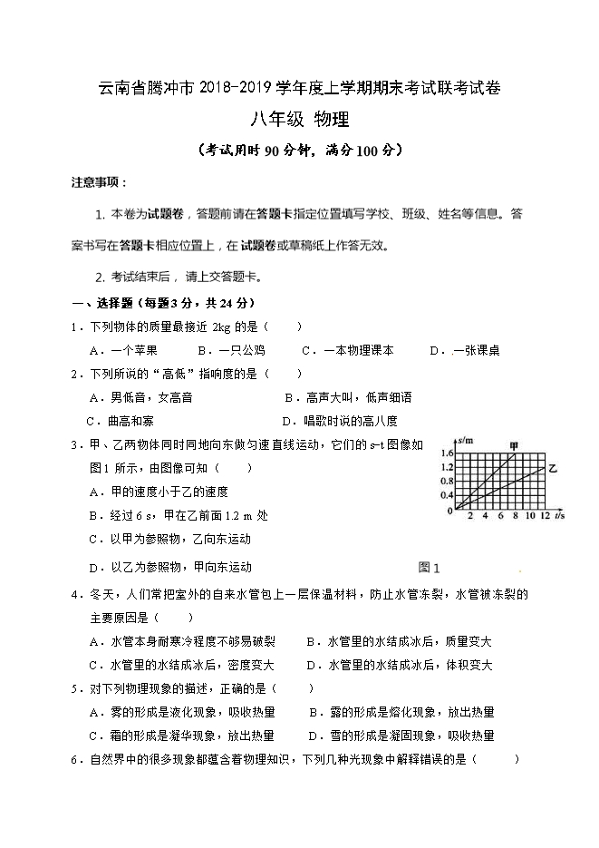 云南省腾冲市十五所学校2018-2019学年八年级上学期期末考试物理试题及答案