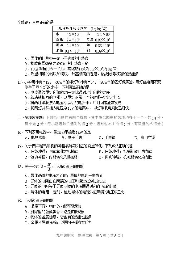 北京市西城区2018—2019学年度第一学期期末考试初三物理试题及答案