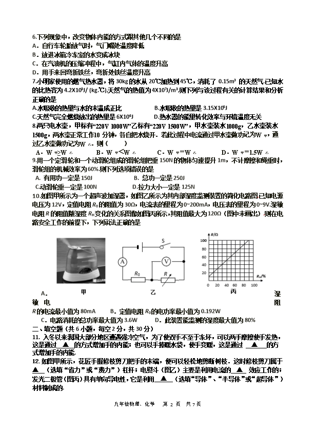 【内容简介】一、选择题(共有10小题,每题2分,共20分.每题只有一个正确答案) 1.关于安全用电常识,下列说法正确的是 A.发生电火灾时,立即用水扑灭 B.插座中的两个线头相接触时不会出现短路现象 C.使用测电笔辨别火线时,手要接触笔尾金属体 D.只要有电流通过人体,就会发生触电事故,所以不能接触任何用电器 2.下列图中的简单机械,不能省力但能省距离的是       3.如图所示为自动垂直升降式车库,可以有效增加停车场空间利用率.在汽车被升降机匀速提升的 过程中,下列说法正确的是 A.动能不变,重力势能不变    B.动能不变,重力势能增加 C.动能增加,重力势能不变    D.动能增加,重力势能增加 4.关于导体的电阻,下列说法正确的是 A.加在导体两端的电压越大,导体的电阻就越大 B.通过导体的电流为零时,导体没有电阻 C.通过导体的电流越大,导体的电阻越小 D.导体电阻的大小决定于导体的材料、长度、横截面积,还和温度有关 5.如图是某品牌的单轮平衡车,它是依靠电力驱动及人体平衡能力控制的代步工具.骑行时,蓄电池给平衡车上的电动机提供动力.为了确保安全,该单轮平衡车电路部分安装有两个开关——电源开关S1和压力开关S2.当手动闭合S1时,指示灯亮起,此时骑行者再站立于平衡车踏板上,S2自动闭合,电动机正常启动,平衡车运动.未闭合S1或骑行者未站立于踏板上,电动机都无法启动.以下电路符合上述要求的是       6.下列现象中,改变物体内能的方式跟其他几个不同的是 A.自行车轮胎放气时,气门嘴处温度降低 B.放进冰箱冷冻室的水变成冰块 C.在汽油机的压缩冲程中,气缸内气体的温度升高 D.用手来回弯折铁丝,弯折处铁丝温度升高 7.小明家使用的燃气热水器,将30kg的水从20℃加热到45℃,消耗了 0.15m3 的天然气.已知水的比热容为4.2X103J/ (kg.℃),天然气的热值为4X107J/m3,则下列与该过程有关的计算结果和分析正确的是 A.水吸收的热量与水的末温成正比           B.水吸收的热量是3.15X105J C.天然气完全燃烧放出的热量是6X106J       D.热水器的能量转化效率与环境温度无关 8.两只电水壶,甲标有“220V 1000W”乙标有“220V 1500W”,甲水壶装水 1000g,乙水壶装水 1500g,两水壶正常工作 10 分钟,各自把水烧开.若此过程中电流通过甲水壶做功记为 W 甲,通过乙水壶做功记为 W 乙.则(   ) A.W 甲≥W 乙B.W 甲<W 乙C.W 甲=W 乙D.W 甲=1.5W 乙 9.用一个定滑 轮和一个动滑轮组成的滑轮组把重150N的物体匀速提升1m,不计摩擦和绳重时, 滑轮组的机械效率为60%.则下列选项错误的是 A. 有用功一定是150J              B. 总功一定是250J C.动滑轮重一定是100N            D.拉力大小一定是125N 10.如图甲所示为一个超声波加湿器,如图乙所示为其内部湿度监测装置的简化电路图.已知电源电压为12V,定值电阻R0的阻值为30Ω,电流表的量程为0~200mA,电压表的量程为0~9V.湿敏电阻R的阻值随湿度RH变化的关系图像如图丙所示,其阻值最大为120Ω(图中未画出).则在电路安全工作的前提下,下列说法正确的是       A.湿敏电阻R的电流最小值为80mA     B.定值电阻R0的电功率最小值为0.192W C.电路消耗的总功率最大值为3.6W      D.此装置能监测的湿度最大值为80% 二、填空题(共6小题,每空2分,共30分) 11. 入冬以来我国大部分地区遭遇强冷空气,为了使双手不至于冻坏,可以两手摩擦使手发热,这是通过  ▲  的方式增加手的内能;也可以手捧暖水袋,使手变暖,这是通过   ▲   的方式增加手的内能.   12.如图甲所示,花匠手握修枝剪刀把手的末端,便可以轻松地剪断树枝.这时修枝剪刀属于 ▲  (选填“省力”或“费力”)杠杆;电熨斗(图乙)主要是利用电流的  ▲  效应工作的;发光二极管(图丙)具有单向导电性,它是利用  ▲  (选填“导体”、“半导体”或“超导体”)材料制成的. ..........