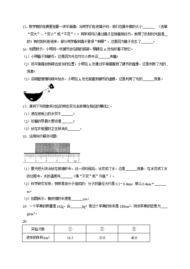 (2)将平面镜放到碗边适当的位置,小明在A处通过平面镜看到了硬币的虚像,这是利用了光的 现象;