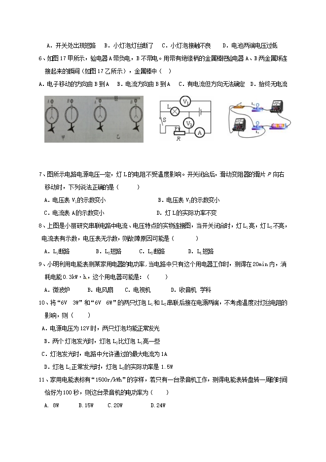 8、上图是小丽研究串联电路中电流、电压特点的实物连接图,当开关闭合时,灯L1亮,灯L2不亮,电流表有示数,电压表无示数,则故 障原因可能是( )