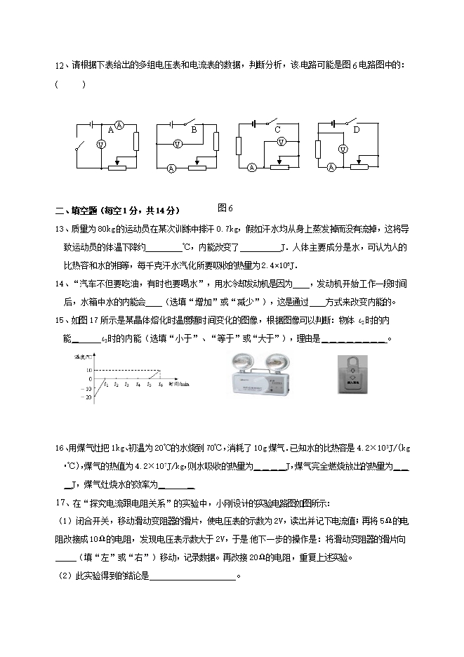 12、请根据下表给出的多组电压表和 电流表的数据,判断分析,该网电路可能是图6电路图中的:( )