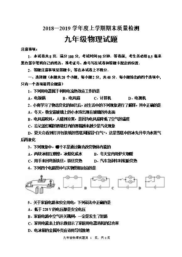 山东省临沂市沂南县2018-2019学年上学期期末九年级物理试题(无答案)