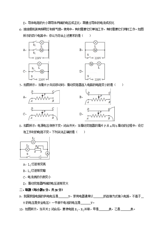 D.导体电阻的大小跟导体两端的电压成正比,跟通过导体的电流成反比