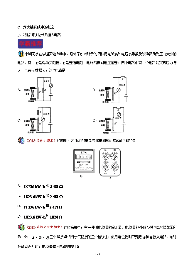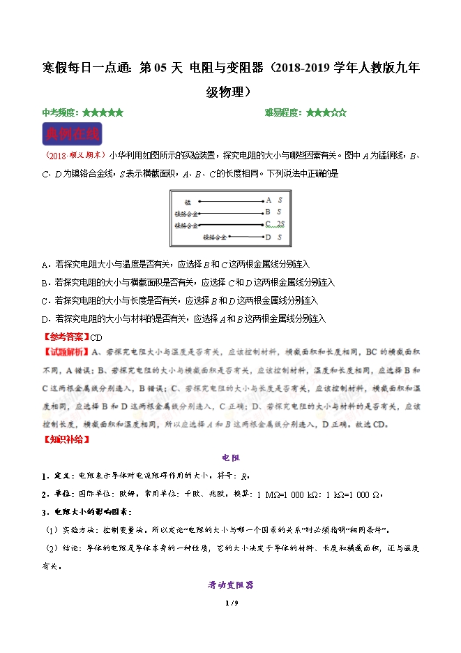 寒假每日一点通:第05天 电阻与变阻器(2018-2019学年人教版九年级物理)