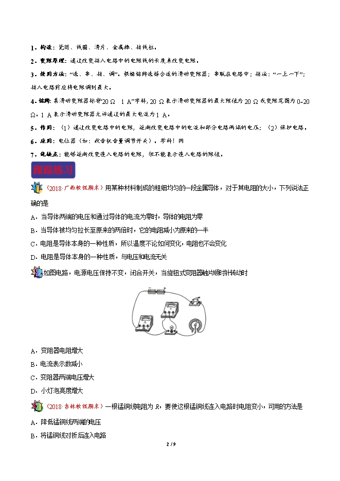 1.构造:瓷筒、线圈、滑片、金属棒、接线柱。
