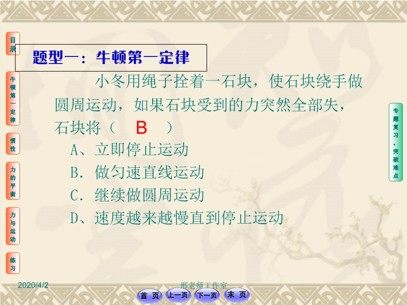 【内容简介】人教版2019年复习:《第八章 运动和力》PPT课件,课件共26幻灯片,课件组织学生对本节知识的复习,主要引导学生复习了牛顿第一运动定律,惯性、二力平衡,课件有知识的复习同时也有练习。