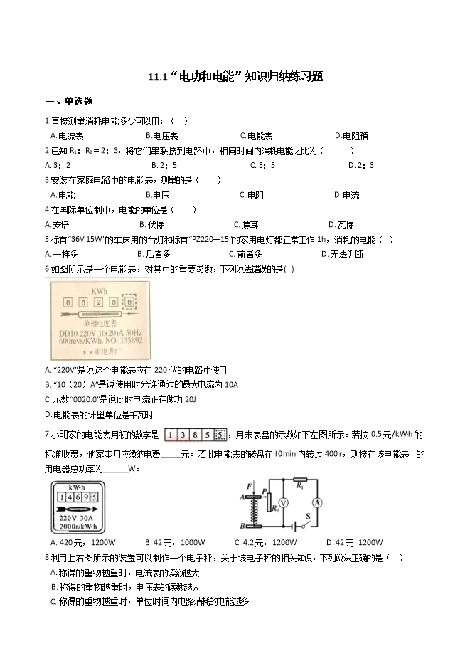北京课改版九年级物理全册:11.1“电功和电能”知识归纳练习题(无答案)