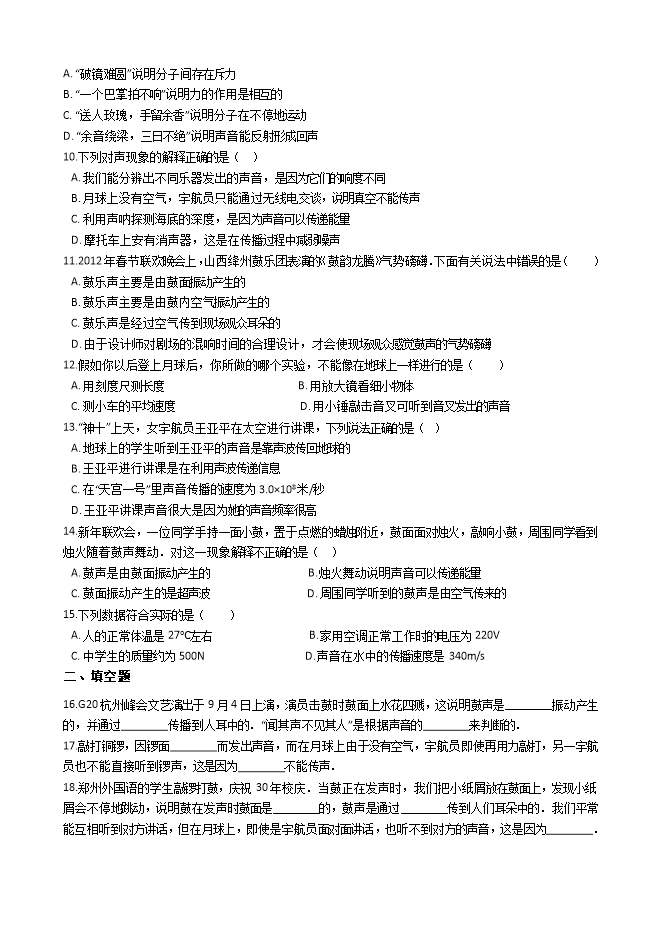 北京课改版八年级物理全册:2.4“声音的产生与传播”知识归纳练习题(无答案)