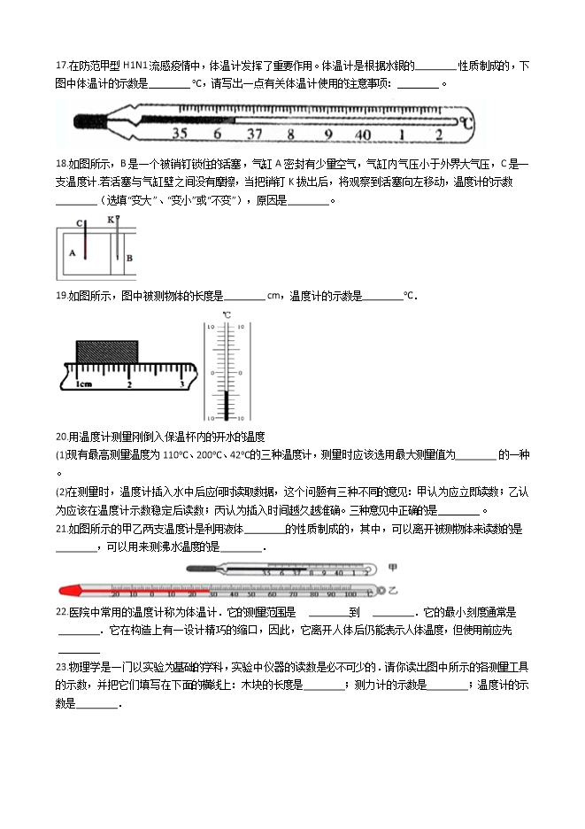 北京课改版八年级物理全册:7.1“温度、温度计”知识归纳练习题(无答案)
