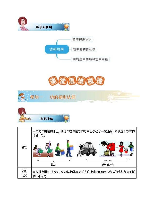 【内容简介】做功一个力作用在物体上, 使这个物体在力的方向上移动了一段距离, 就说这个力对物体做了功.