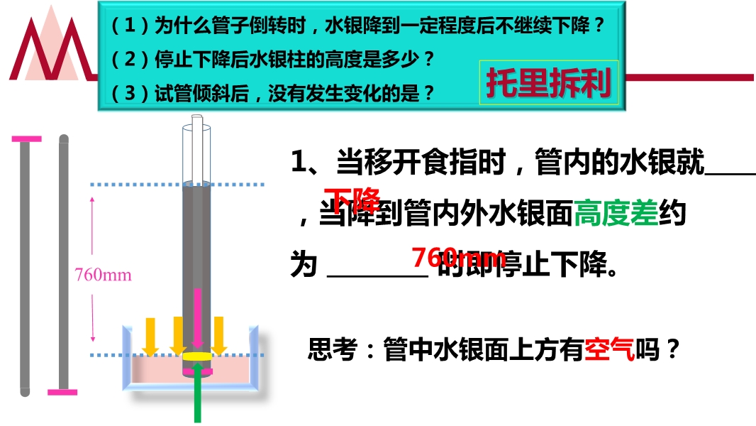【内容简介】人教版《9.3大气压强》PPT课件(第一课时),共有15张幻灯片,课件引导学生认识了大气压强的产生,引导学生观察和列举日常生活中的事例说明了大气压强的存在,引导学生学习了大气压强的测量方法等。