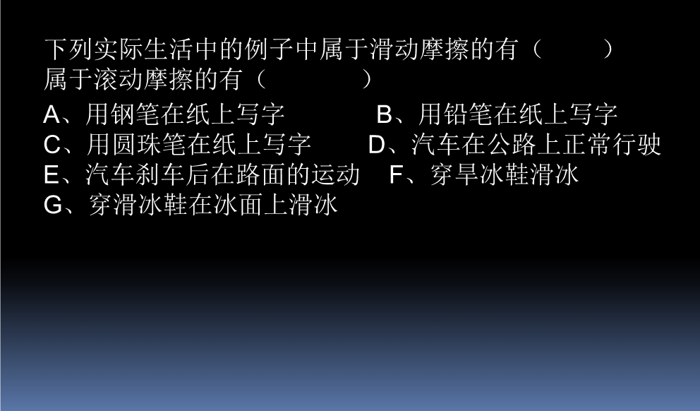 【内容简介】教科版《7.5摩擦力》ppt课件,课件43张幻灯片,课件主要引导学生讨论了摩擦的分类,并引导学生讨论了生活中存在的摩擦,重点引导学生探究了滑动摩擦力的大小与哪些因素有关,课件最后引导学生如何增大和减小摩擦。